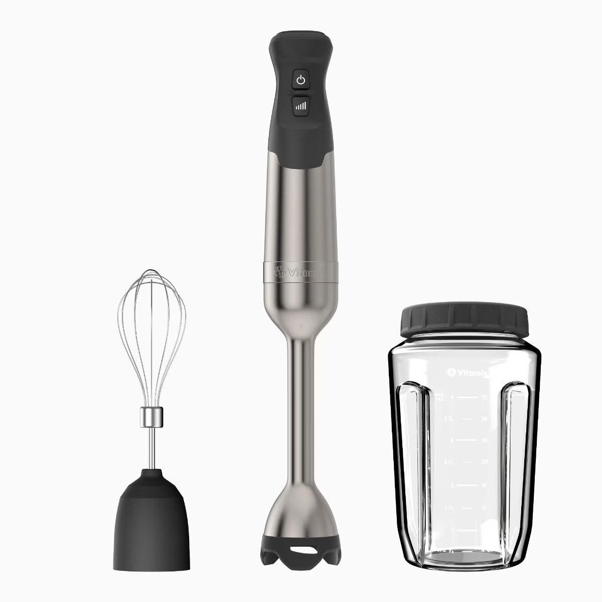 The 3-Piece Immersion Blender Bundle comes with a whisk attachment to quickly whip up aquafaba, cream, and more, and blending jar designed like a Vitamix blender container, for a Vitamix-quality blend every time.