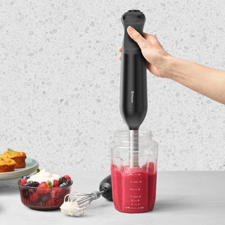 The Immersion Blending Jar design was inspired the standard Vitamix container. The unique shape efficiently moves ingredients through the blades, for a consistent, high-quality blend quality every time. It’s easy to blend right in the 0.9-litre jar, then take it on the go, or store in the fridge for later. Plus, the mouth of the jar is compatible with standard, wide-mouth canning jar lids.