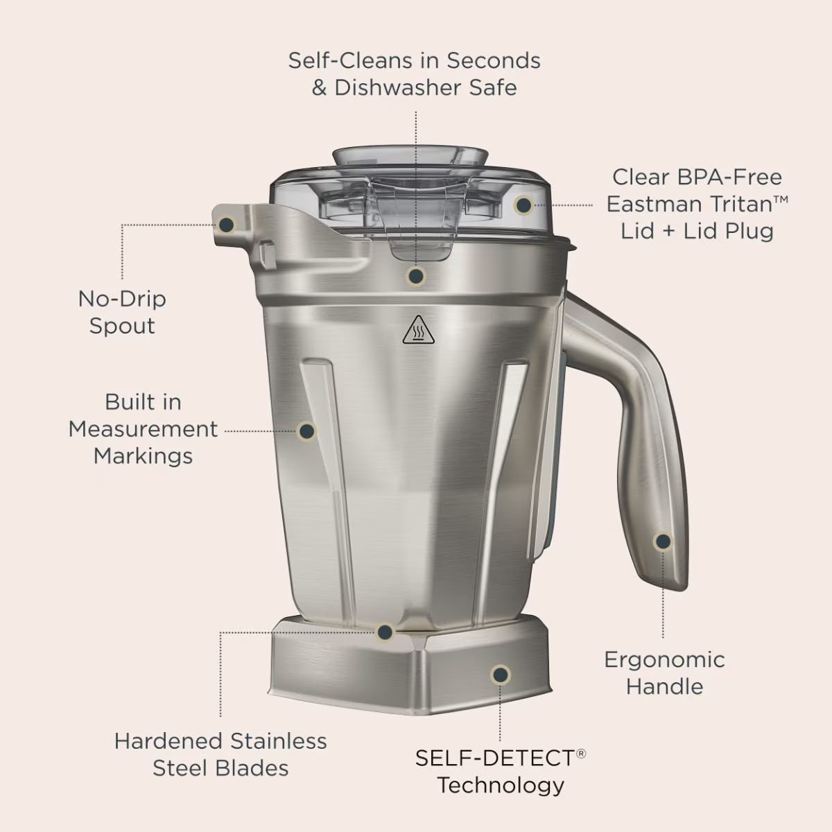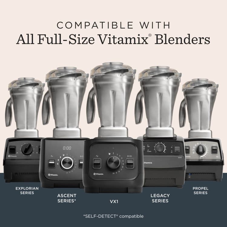 Le récipient en acier inoxydable est compatible avec tous les mélangeurs Vitamix de taille standard.