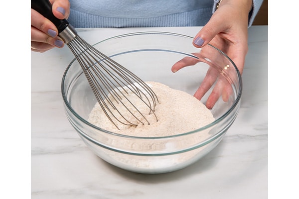 Preheat oven to 350°F (180°C). Spray an 8 1/2-inch x 4 1/2-inch (21.25 cm x 11.25 cm) loaf pan with cooking spray. Combine flours, baking soda, baking powder, and salt in a medium-size mixing bowl. Set aside.