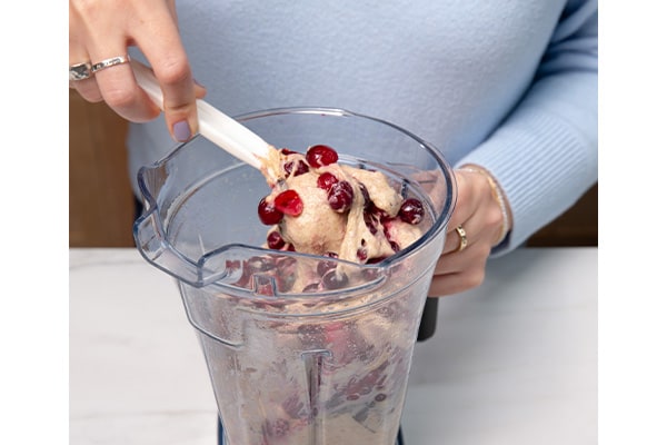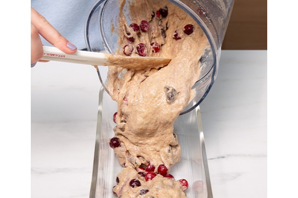 Add the dry mixture to the Vitamix container and secure the lid. Start the blender on its lowest speed, then quickly increase to its highest speed. Blend for 20 seconds, using the tamper to push ingredients toward the blades. Transfer to a mixing bowl to fold in the apricots and cranberries.