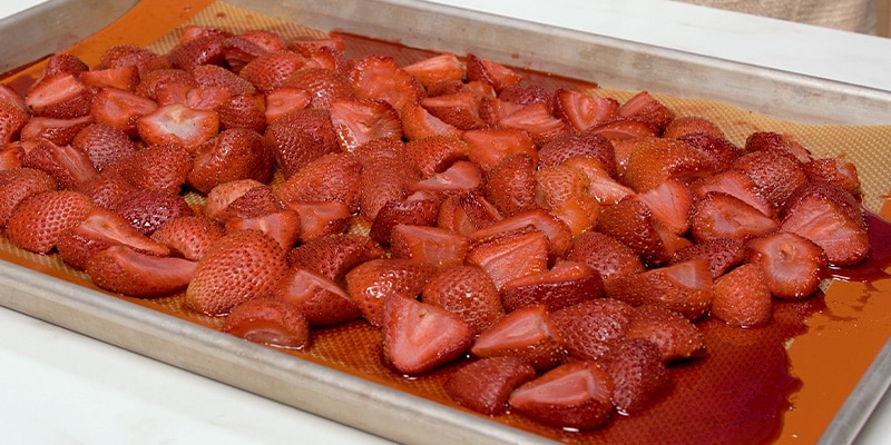 Preheat the oven to 350°F and line a sheet pan with a silicone baking mat. If you do not have a silicone mat, parchment should still help with sticking and cleanup, but the key is giving the berries room to roast in a single layer.