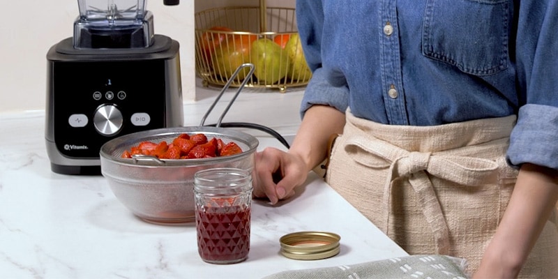 Add the milk, sugar, and 1 1/2 pounds of frozen roasted strawberries to the Vitamix container in the order listed and secure the lid.