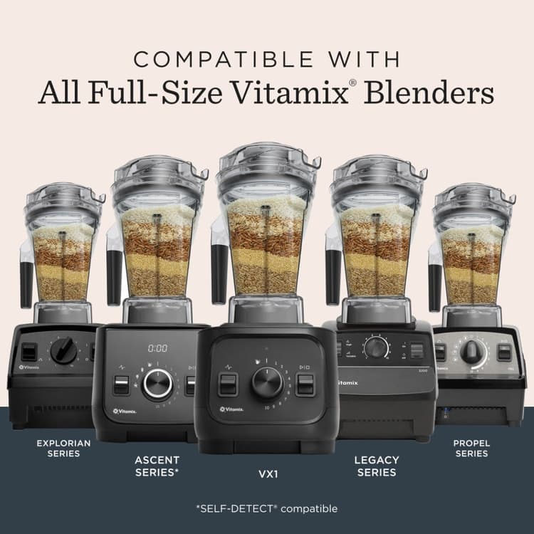 This container can be used with all full-size Vitamix® blenders, however SELF-DETECT® features are only available with Smart System machines. Enjoy the convenience of up to five Dry Grains Container Blending Programs when paired with an Ascent Series Blender.
