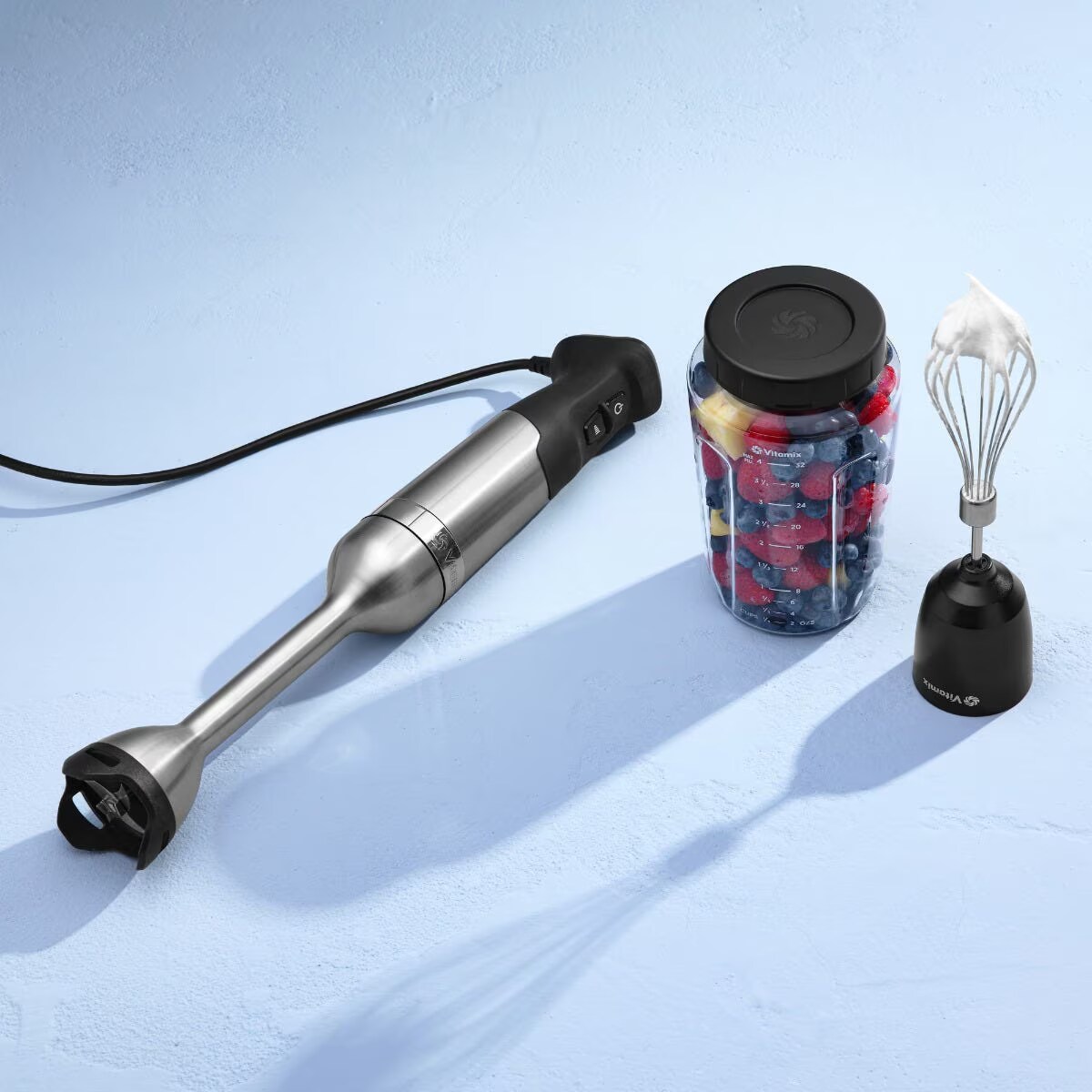 The 3-Piece Immersion Blender Bundle comes with a whisk attachment to quickly whip up aquafaba, cream, and more, and blending jar designed like a Vitamix blender container, for a Vitamix-quality blend every time.