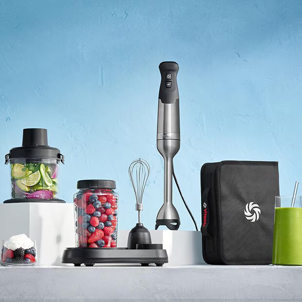 The Immersion Blender delivers performance you can trust. Create ideal textures from whole-food ingredients like greens and frozen fruit, and enjoy the convenience of blending in your favorite container. This bundle includes the 5-Speed Immersion Blender and all Immersion Blender accessories.
