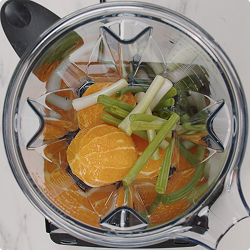 Vitamix blenders quickly break down large chunks of fruit and veggies—you don't have to chop anything smaller than a quarter of an apple. Long, skinny ingredients like carrots and celery can be added whole through the lid while the blender is running.